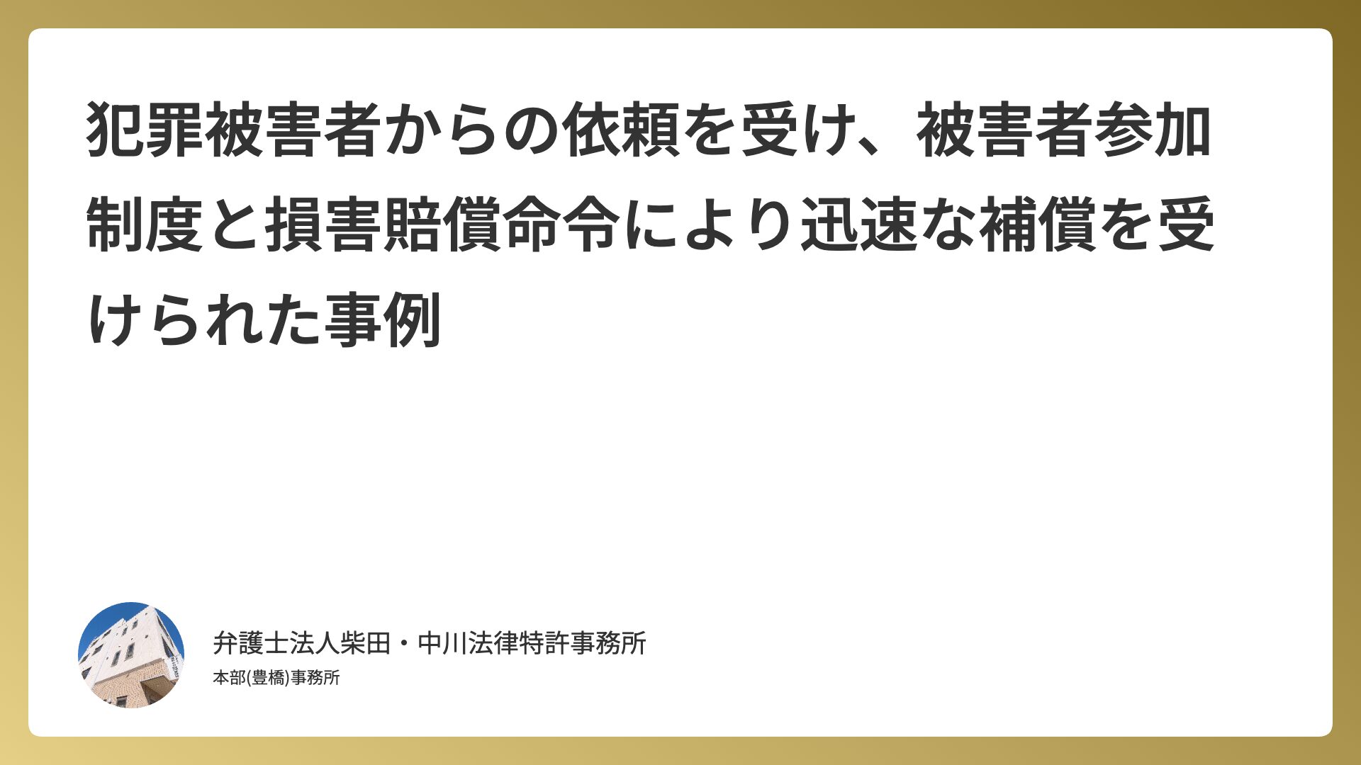 犯罪被害者からの依頼を受け、被害者参加制度と損害賠償命令により迅速な補償を受けられた事例 2026.02.22 当事務所の解決事例 Arai_shibata 弁護士法人柴田・中川法律特許事務所 豊橋事務所