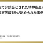 2026.02.22 当事務所の解決事例 事前認定で非該当とされた精神疾患について後遺障害等級7級が認められた事例 Arai_shibata 事故態様四輪車×四輪車結果非該当→7級1,860万円 事案の概要 依頼者は50代女性、信号無視車両に衝突され、車体が横転したときの恐怖で精神疾患を発症してしまった事案。 事前認定では非該当であったが、訴訟においては後遺障害等級7級が認められ、和解に至りました。 About 弁護士法人柴田・中川法律特許事務所本部(豊橋)事務所