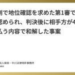 第1審で地位確認を求め、請求が認められた。判決後に訴外で従業員としての地位があることを前提として合意退職する内容の和解をしました。